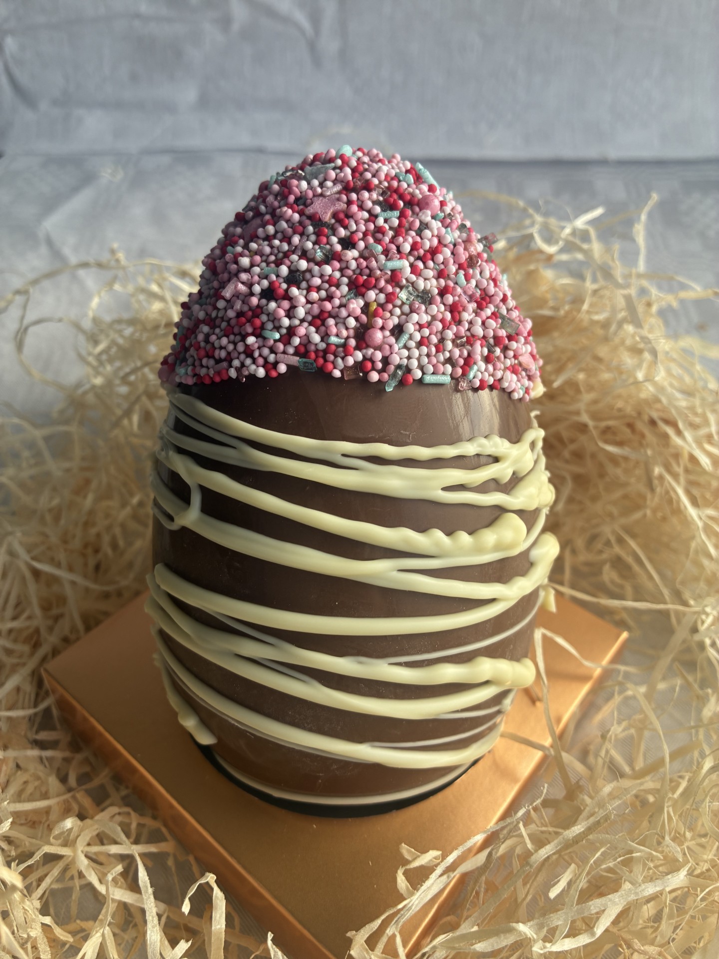 Milk chocolate hollow egg designed beautifully with white chocolate and sprinkles.