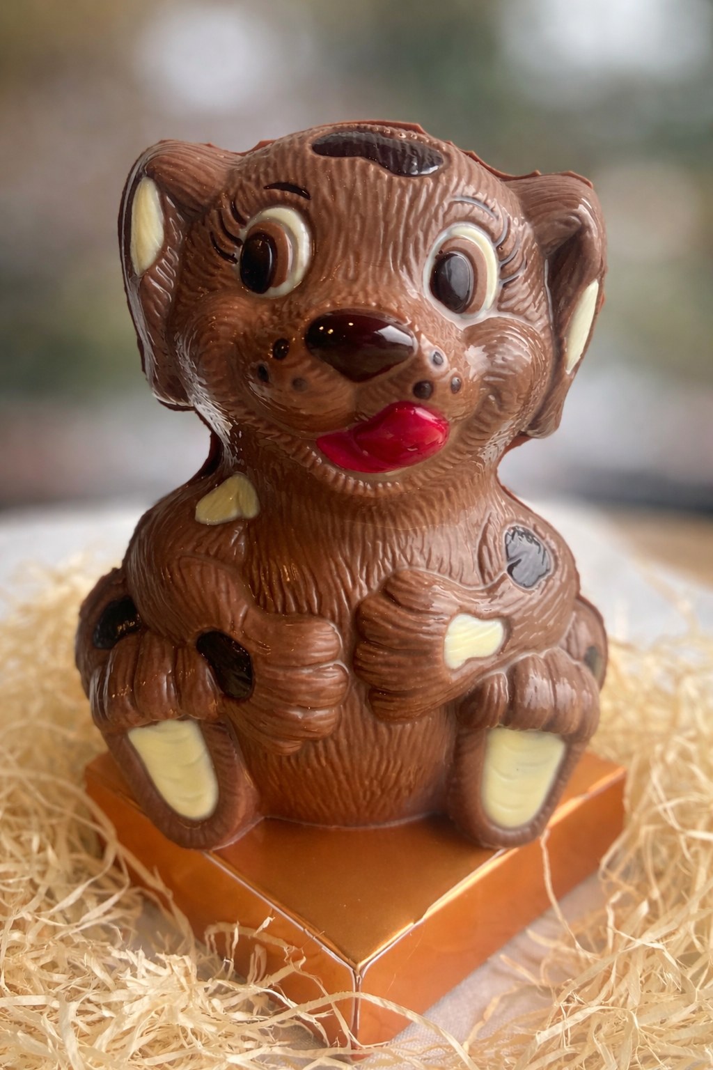 Our Milk Chocolate Dog is an adorable handmade treat, crafted on the farm using smooth, creamy milk chocolate and beautifully decorated with dark and white chocolate for charming detail and contrast. Each dog is individually finished, making every piece unique and full of character.