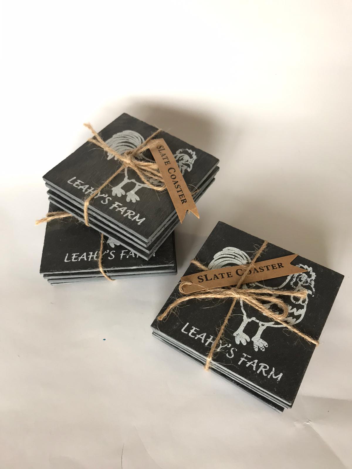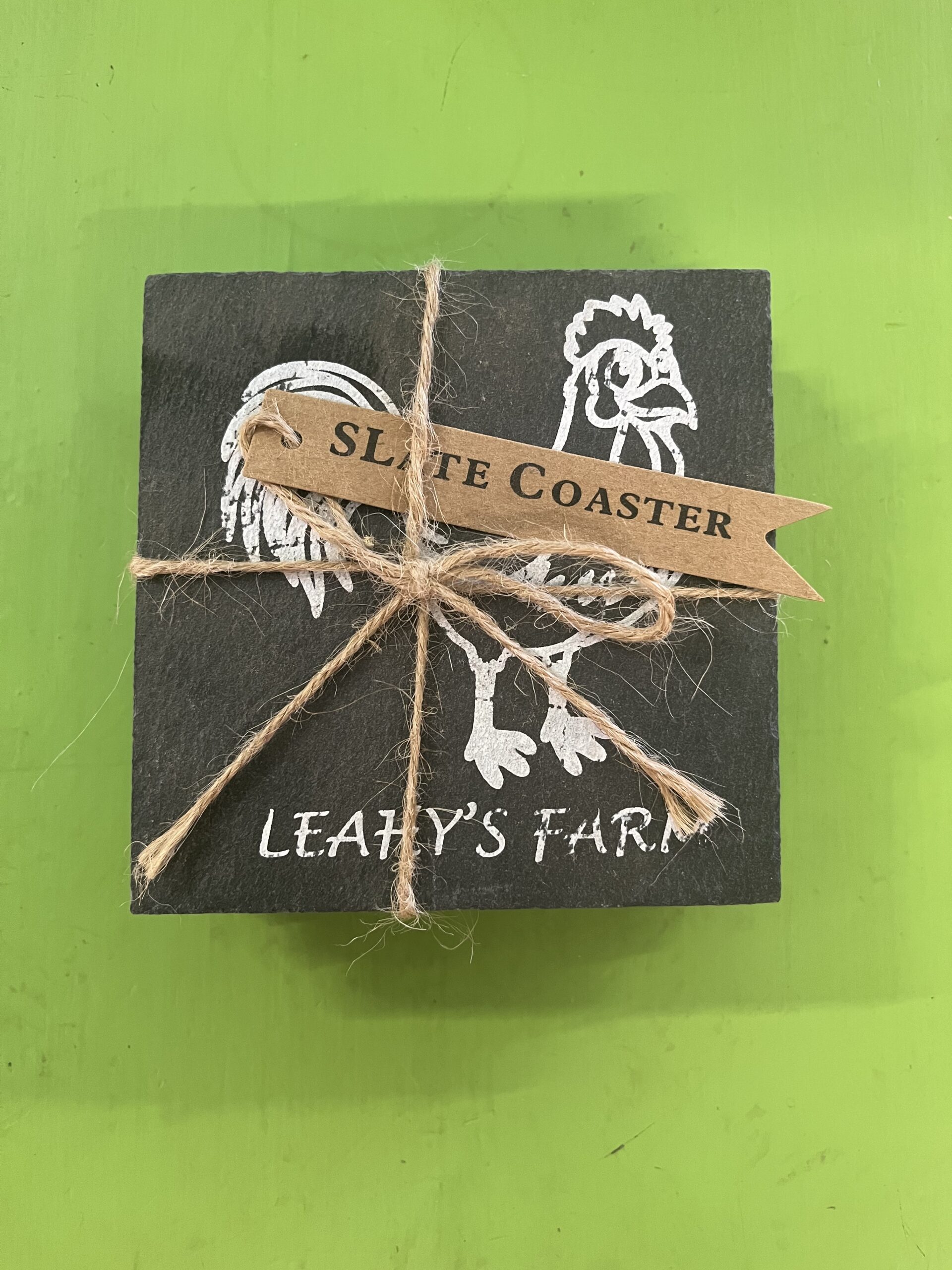 Protect your surfaces in style with this pack of 4 slate Leahys Open Farm coasters. Each coaster is crafted from natural slate, featuring a rustic design that adds a touch of charm to your home or office.